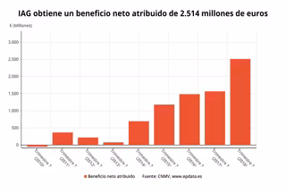 IAG, el 'holding' que agrupa a Iberia, British Airways (BA), Vueling, Aer Lingus y la marca LEVEL, registró un beneficio neto de 2.514 millones de euros durante los nueve primeros meses del año, lo que supone un incremento del 57,4% respecto al mismo periodo del ejercicio anterior.