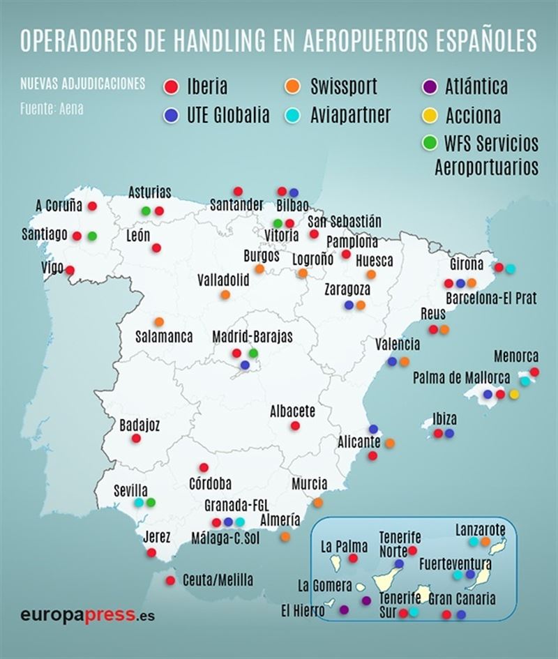 Iberia (15 licencias y dos lotes), Globalia en UTE con Iberhandling (once licencias), Swissport (cinco y un lote), Aviapartner (siete licencias), WFS Servicios Aeroportuarios (cuatro), Atlántica de Handling (una) y Acciona (una) prestarán los servicios de 'handling' en rampa en 43 aeropuertos de la red de Aena durante siete años. El actual convenio colectivo obliga, dentro de unos plazos, a la subrogación completa de plantilla por parte de los nuevos operadores de 'handling'.