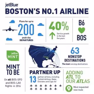 Además de los vuelos entre Boston y Atlanta, JetBlue también ha anunciado servicios adicionales desde Boston a San Francisco, con un cuarto vuelo diario de Mint a la ciudad de California a partir del 15 de julio de 2017. También ofrecerá volará a Montego Bay (Jamaica) y Saint Thomas (Islas Vírgenes) todo el año, ampliando sus operaciones estacionales.