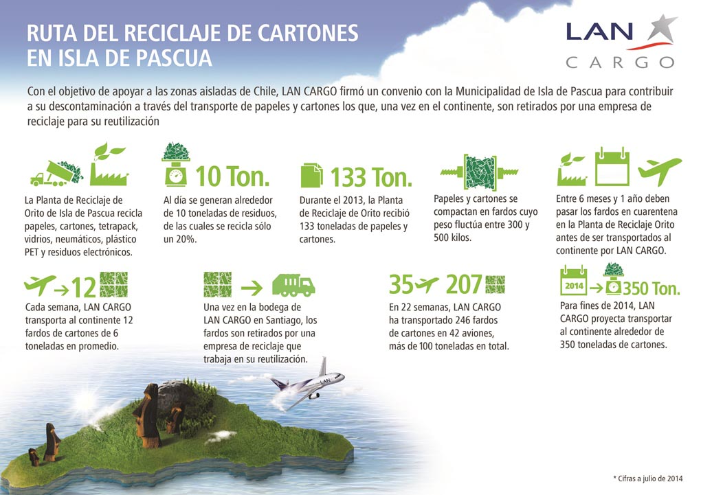 La división de carga de la compañía LAN transportará 24 toneladas de cartón al mes desde la Isla de Pascua a Santiago de Chile para su posterior reciclaje y reutilización.