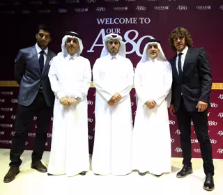 El jugador del FC Barcelona Luis Suárez y el excapitán y ahora adjunto a la dirección deportiva Carles Puyol fueron junto al director general del club, Antoni Rossich, los integrantes de la expedición blaugrana que asistieron a la llegada a Doha (Catar) del primer superjumbo A380 de la aerolínea Qatar Airways, empresa que patrocina la camiseta del equipo.
