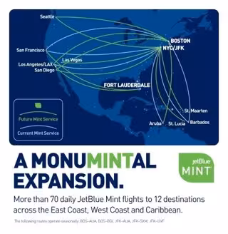 Mint ha superado las expectativas de la aerolínea desde su lanzamiento en 2014. Las nuevas rutas incluirán a Fort Lauderdale, Las Vegas, San Diego y Seattle, y aumentarán sus frecuencias a Nueva York (JFK), Boston, Los Ángeles y San Francisco. Una vez completado dicho plan, JetBlue ofrecerá hasta 70 vuelos diarios de Mint a más de 12 destinos en toda la costa este, costa oeste y el Caribe.