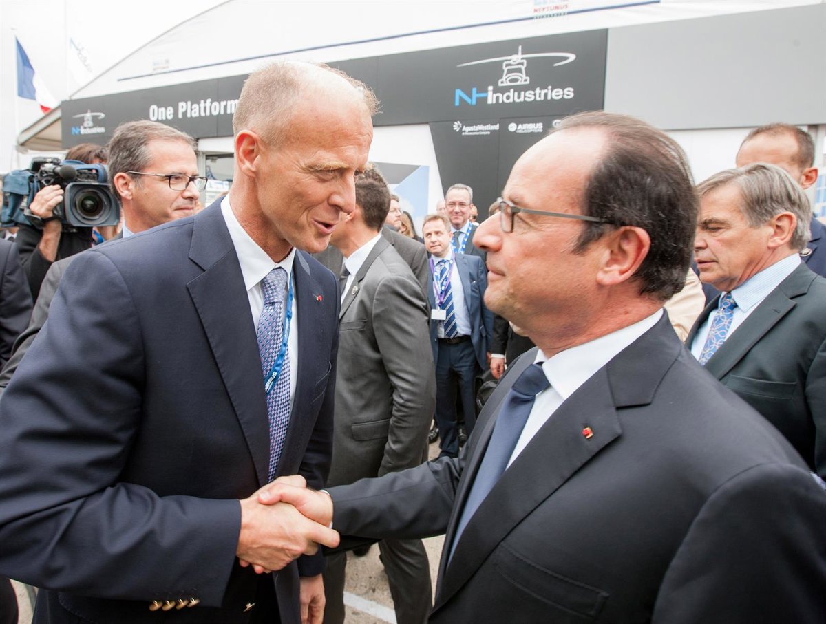 El presidente francés, François Hollande, visitó este lunes la feria a bordo de un A350 XWB, y fue recibido por el consejero delegado de Airbus Group, Tom Enders, junto a otros altos ejecutivos del consorcio europeo.