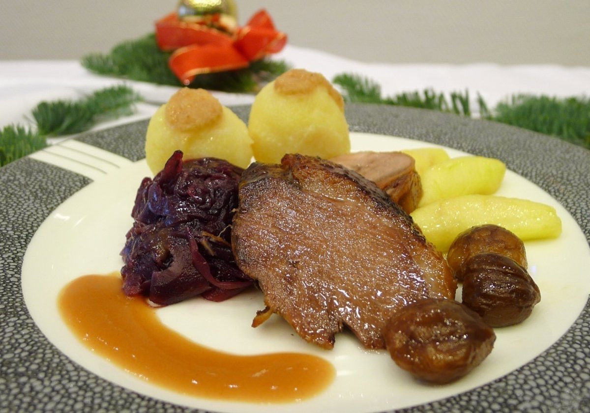 Para primera clase y Business, la aerolínea ha elaborado un menú a base de capón relleno de frutos rojos con salsa cremosa al cava, todo ello acompañado de chalotas caramelizadas y patatas rosemary asadas. El menú lo completa un pudin de manzana tibia con mantequilla de canela y crema de vainilla.