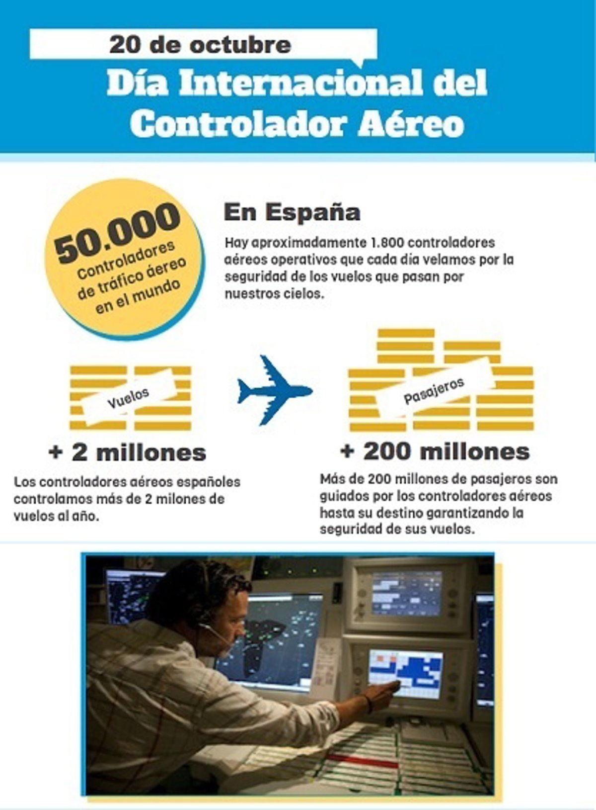 Más de 50.000 controladores aéreos en el mundo, incluidos los 1.800 operativos en España, celebrarán el Día Internacional del Controlador Aéreo el próximo día 20 de octubre con motivo del 52 aniversario de la la creación de la Federación Internacional de Asociaciones de Controladores de Tránsito Aéreo (IFATCA).