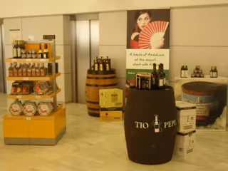 Hasta finales del próximo mes de septiembre, los pasajeros que transiten por la sala de embarque podrán probar y adquirir una variada oferta de artículos, que abarca desde vino fino, brandy y licores, hasta aceite de oliva, mermeladas o conservas.