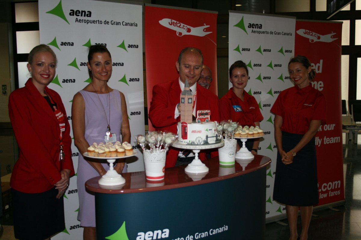 Por su parte, a la llegada del vuelo, la jefa de Relaciones Externas y Protocolo, Teresa Paola Romero, y el jefe de Gabinete del Aeropuerto, Ernesto Robayna, junto al jefe de Escala de Jet2.com, Antonio Bravo Domínguez y personal la compañía, dieron la bienvenida a los pasajeros y a la tripulación con una tarta conmemorativa.
