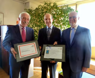 El sello de Excelencia Europea 400+ otorgado a Madrid-Barajas fue recibido por el director del Aeropuerto de Madrid-Barajas, Miguel Angel Oleaga, de la mano del director de Relaciones Institucionales de Bureau Veritas Certification, Enrique Quejido.