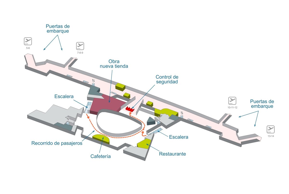 La primera actuación de las obras consiste en la remodelación de la tienda Canariensis, situada en la planta alta, lo que conlleva una modificación del flujo de los pasajeros de vuelos nacionales e internacionales, que hasta ahora accedían al control de seguridad por ahí.