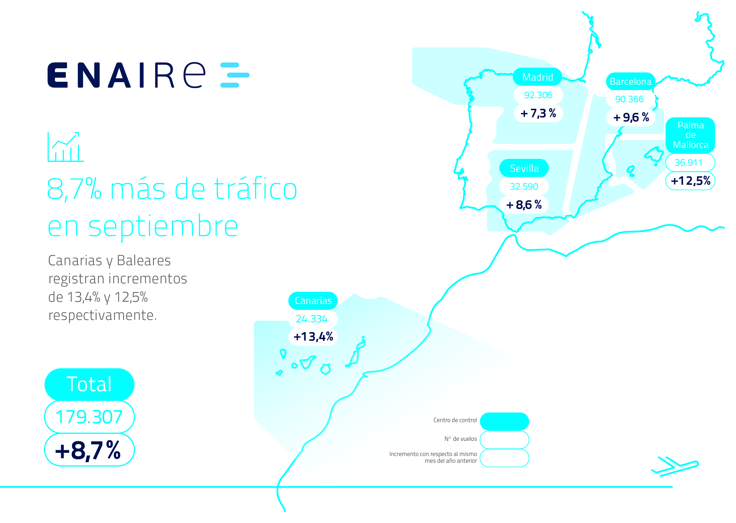 Un total de 179.307 vuelos se han gestionado en septiembre en el conjunto del espacio aéreo español, un 8,7% más que en el mismo mes del pasado año, en un mes de septiembre histórico, según datos de ENAIRE, la matriz de Aena.