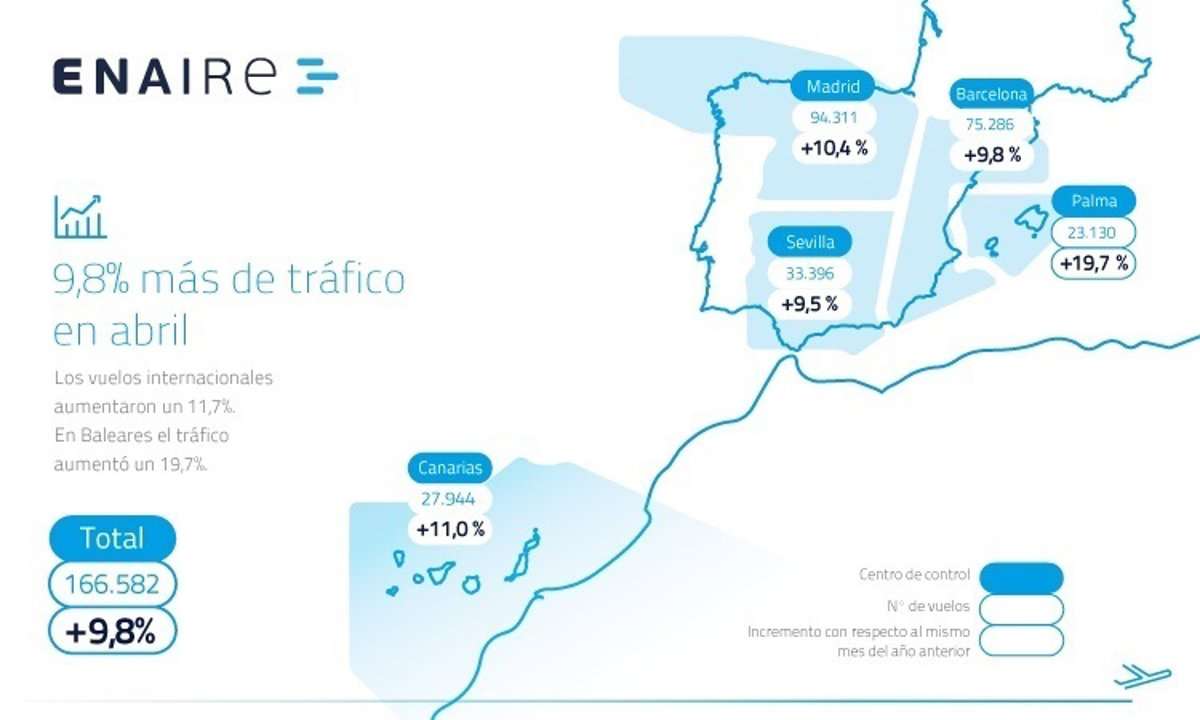 Un total de 166.582 vuelos se gestionaron en el espacio aéreo español durante el mes de abril, lo que supone un aumento del 9,8% en comparación con el mismo mes de 2016, teniendo en cuenta que la Semana Santa, que este año cayó del 13 al 17 de abril frente a marzo del año pasado, impulsó la demanda de viajes aéreos.