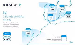 Más de 215.000 vuelos se gestionaron en el espacio aéreo español en julio, lo que supone un 2,9% más en tasa interanual, mes en el que España batió el récord histórico de vuelos gestionados en un día: fue el sábado 28 del mes pasado con 7.343 vuelos gestionados en un solo día, 280 movimientos más que el día pico de julio de 2017.