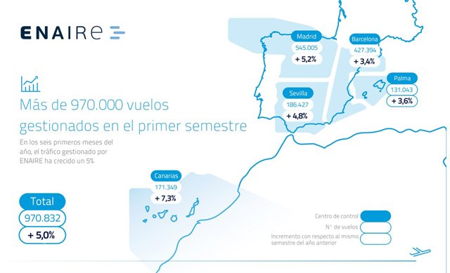 Más de 970.000 vuelos se gestionaron en el espacio aéreo español en la primera mitad del año, lo que supone un 5% más que en el primer semestre de 2017, según los datos publicados hoy por ENAIRE, gestor de navegación aérea y matriz de Aena, en un periodo en el que el tráfico aéreo ha crecido un 5%.