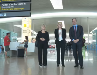 La responsable del departamento de Estrategia del Aeropuerto de Gatwick, Adele Hill, y el de Desarrollo de Producto, Angus McIntyre, son los representantes que se han desplazado a Barcelona para conocer de cerca el funcionamiento de la T1.