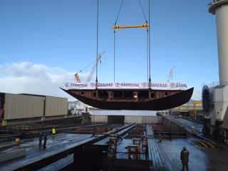 Una vez finalizadas las intervenciones, los directivos han pulsado un botón para accionar la grúa que ha colocado la quilla en la plataforma para su construcción. A continuación, han colocado en la quilla nueve monedas para conmemorar el año de nacimiento de los hijos de los distintos socios y "darle buena suerte al buque".