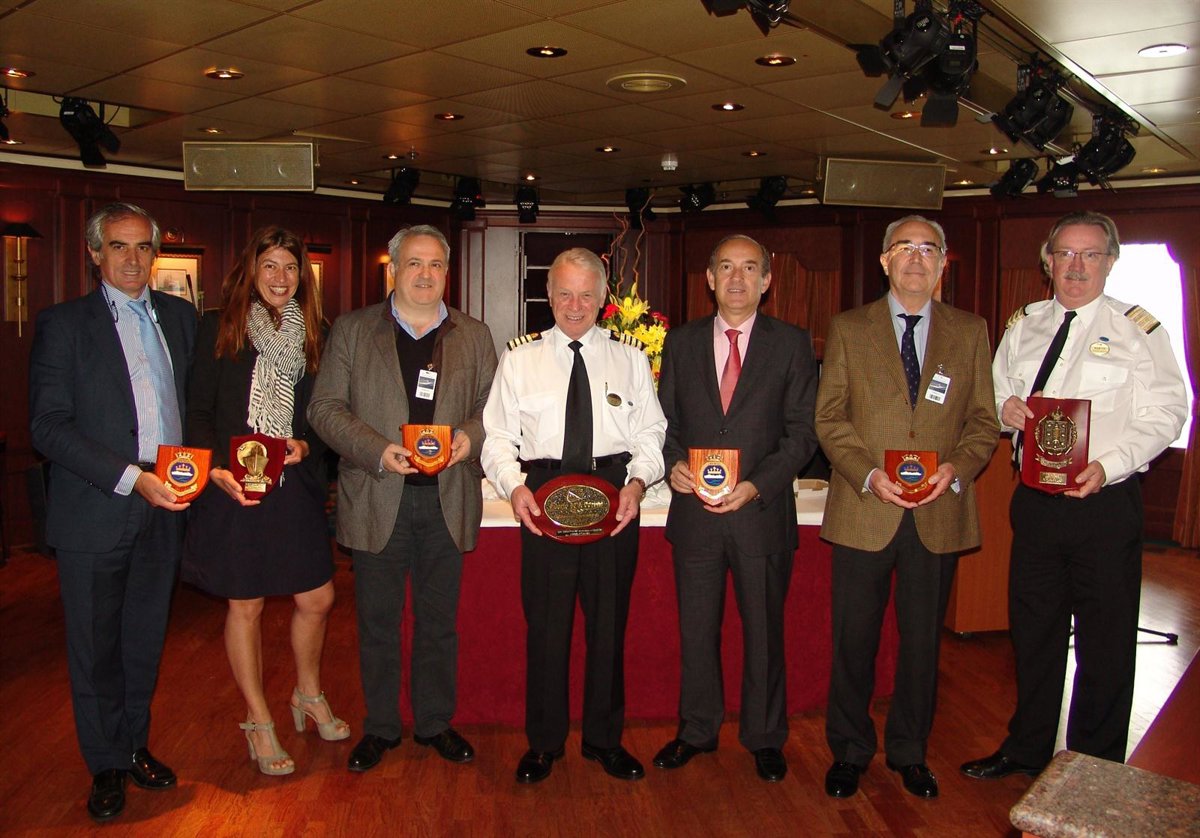 Tanto el presidente de la Autoridad Portuaria de A Coruña, Enrique Losada, como el concejal de Economía y Hacienda del Ayuntamiento, Roberto Coira, procedieron al tradicional intercambio de metopas con el capitán del crucero.