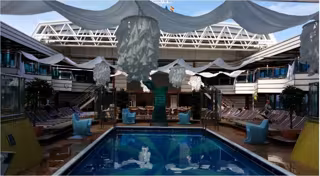 Por la noche, la fiesta se traslada a la cubierta exterior, donde a partir de las 10 de la noche música, diversión y bailes estarán asegurados en una espacio completamente centrado en el color blanco y donde los viajeros podrán disfrutar de deliciosas fresas con chocolate blanco y una presentación de estatuas de hielo.