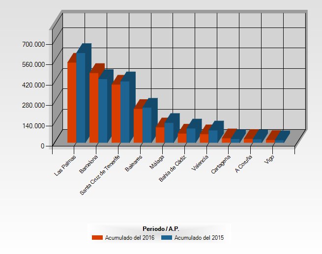 No obstante, los cruceristas supusieron un 26,6% del total de pasajeros registrados en el conjunto de los puertos españoles, que ascendió a 7,52 millones de viajeros en transporte marítimo, un 3,7% más.