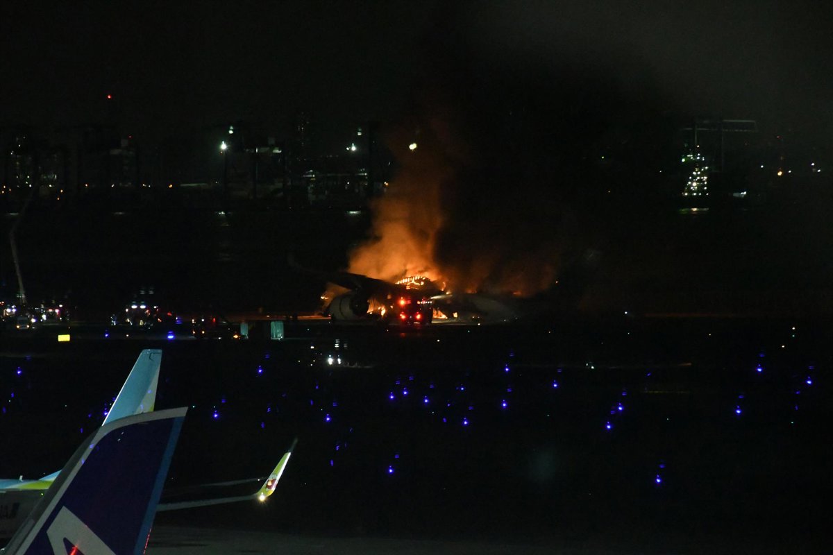 Avión de Japan Airlines accidentando en Tokio.