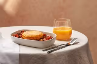 Los platos principales incluyen: tortilla española con pisto manchego, servida en el desayuno; costillas de ternera estofadas en salsa barbacoa, con mojo rojo y polenta; pimientos del piquillo rellenos de queso de cabra y setas; pollo con salsa de jerez y frutos secos, puré de apio nabo y patata, zanahorias asadas y cebollitas, etc.