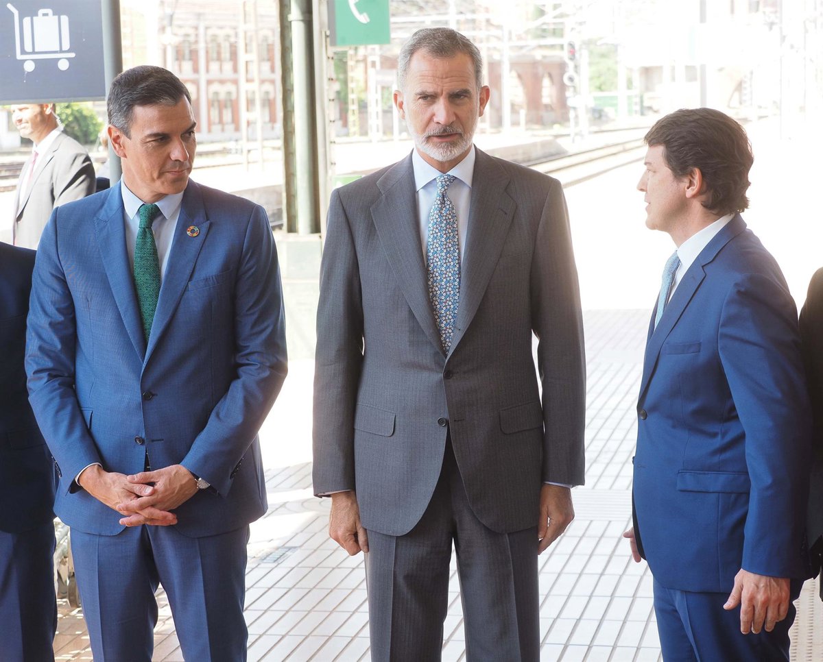 Pedro Sánchez, el Rey Felipe VI y Alfonso Fernández Mañueco en la estación de tren. - EUROPA PRESS/PHOTOGENIC PR