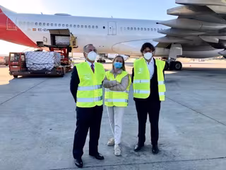 Para celebrar los hitos conseguidos, la carga de material de este viernes ha sido recibida por la secretaria general de Fenin, Margarita Alfonsel; el presidente ejecutivo de Grupo Oesía, Luis Furnells, y el director de Ventas de Iberia, Guillermo González.