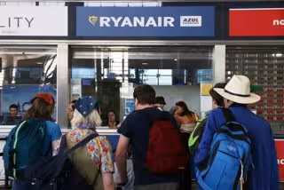 Varias personas se acercan a las ventanillas de Ryanair que durante estos días los trabajadores de dicha empresa están huelga por sus condiciones laborales en el aeropuerto Costa del Sol en la capital, a 1 de julio de 2022 en Málaga (Andalucía, España). - Álex Zea - Europa Press