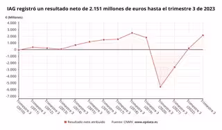 El 'holding' de aerolíneas IAG ha obtenido un beneficio después de impuestos de 2.151 millones de euros en los nueve primeros meses del año, lo que supone multiplicar casi por once las ganancias que registró en el mismo periodo del año anterior, y ha registrado un beneficio récord en el tercer trimestre.