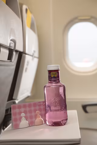En cuanto a las dos Premium Lounge de la T4 del aeropuerto de Madrid, aquí las botellas de cortesía disponibles para los clientes de Iberia también serán de color rosa.