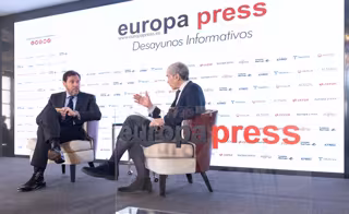 El ministro de Transportes y Movilidad Sostenible, Óscar Puente (i) y el director de Europa Press, Javier García Vila (d), intervienen durante un desayuno informativo de Europa Press, en el hotel Rosewood Villa Magna - Eduardo Parra - Europa Press
