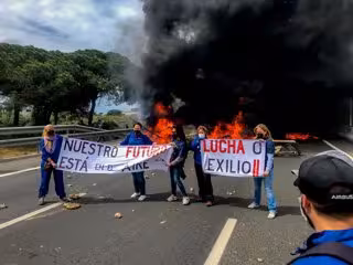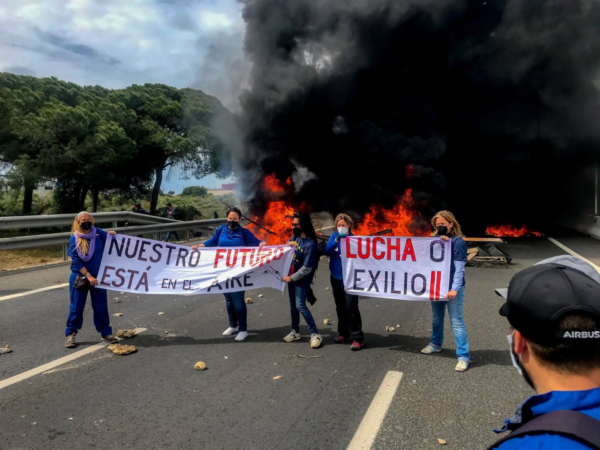 Archivo - Varias trabajadoras se fotografían en el incendio provocado por parte de la plantilla de la factoría de Airbus de Puerto Real. - Emilio López - Archivo