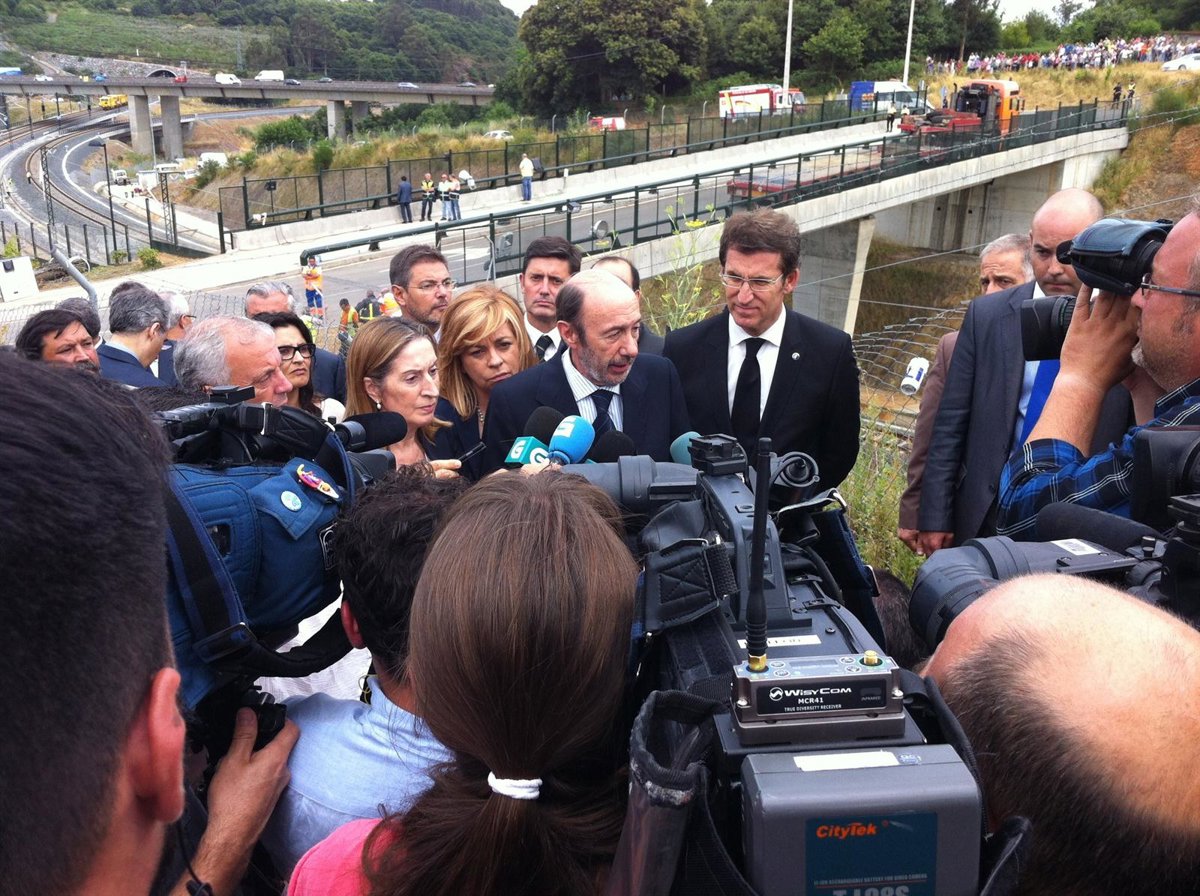 Rubalcaba ha llegado al lugar del siniestro, en la compostelana localidad de Angrois, sobre las 17.45 horas en compañía del presidente de la Xunta, Alberto Núñez Feijóo, de la ministra de Fomento, Ana Pastor, de la vicesecretaria general de los socialistas, Elena Valenciano, y del secretario general del PSdeG, Pachi Vázquez, entre otras personas.