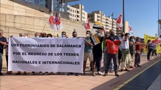 La protesta se ha llevado a cabo en la estación de Salamanca al paso del tren 'Connecting Europe Express' fletado por la Comisión Europea, que conectará las capitales de toda Europa con motivo del Año Europeo del Ferrocarril.
