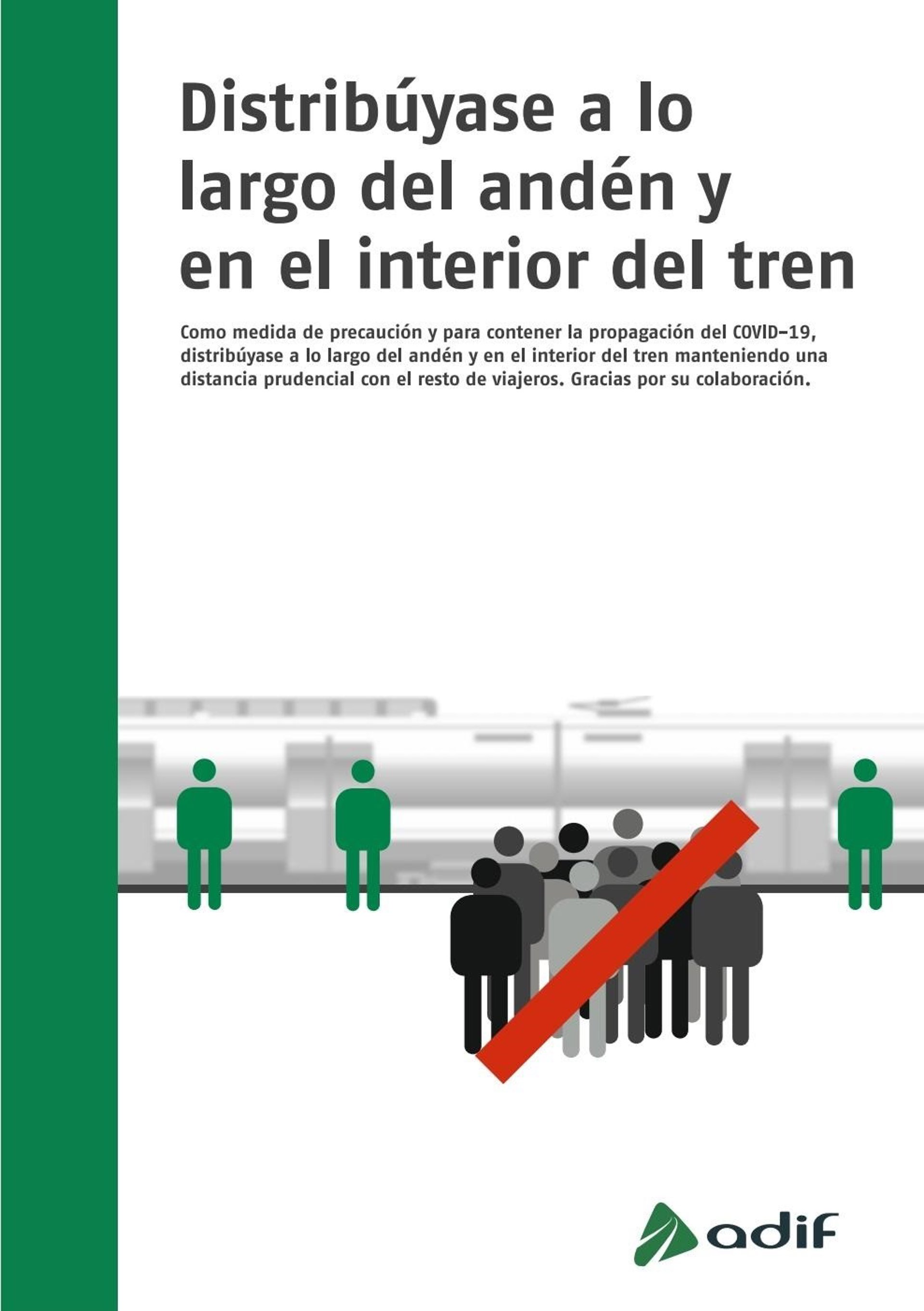 Los carteles distribuidos por Adif en las estaciones recogen el siguiente mensaje en letras de gran tamaño: "Distribúyanse a lo largo del andén y en el interior del tren".