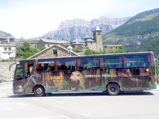 Dinópolis se promociona en el Parque Nacional de Ordesa, en el Pirineo de Huesca, con un autobús tematizado que estará circulando para los turistas hasta el 15 de octubre, desde el municipio de Torla.
