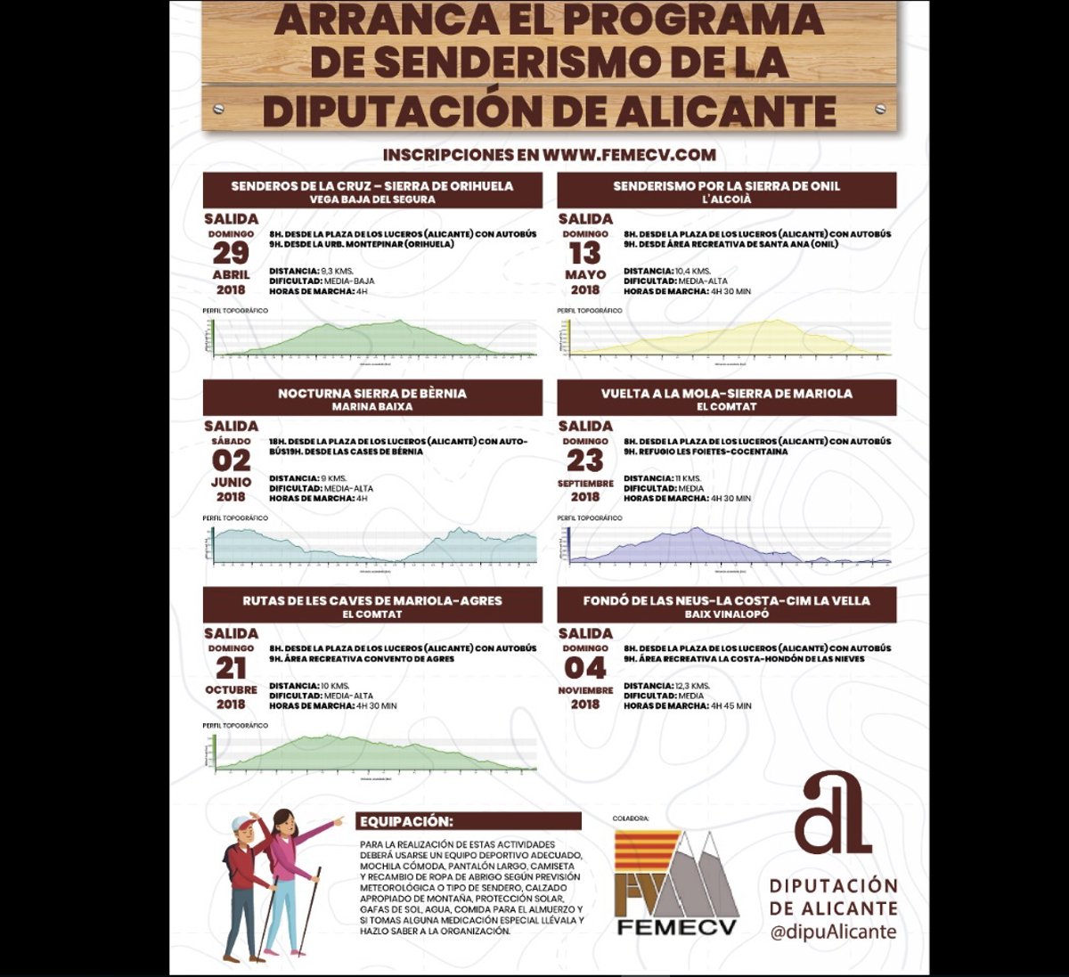El programa 'Senderismo con la Diputación' está organizado por la institución provincial, a través del área de Deportes, y cuenta con la colaboración de la Federació d'Esports de Muntanya i Escalada de la Comunitat Valenciana.