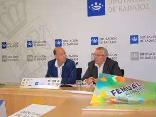 El diputado de Turismo, Lorenzo Molina, y el alcalde de Alconchel, Óscar Díaz, han presentado en la Diputación de Badajoz esta Feria de Muestras en la que se expondrán más de 60 cabezas de ganado de la comarca como la yeguada Cabeza Rubia, vacas charolesas y las ovejas merinas de la Finca La Cocosa de la institución provincial, además de unas 100 aves de diferentes especies.