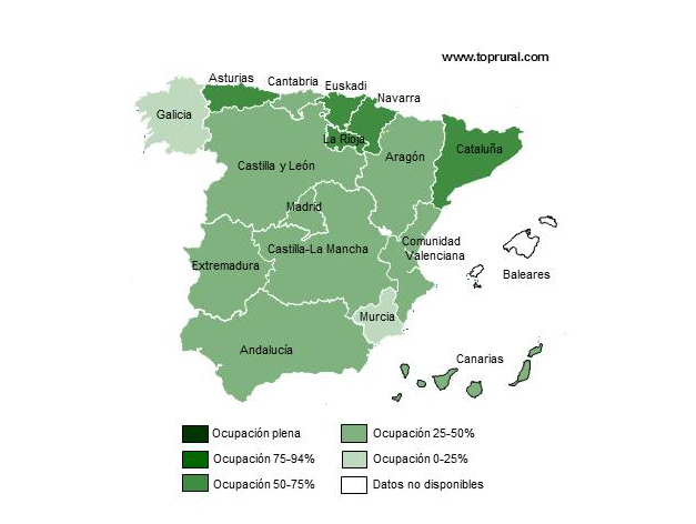 Frente a éstas, las provincias españolas con menor nivel de ocupación en turismo rural en este fin de semana son: Murcia (11% de ocupación), A Coruña (13% de ocupación), Almería (17% de ocupación), Pontevedra (22% de ocupación) y Sevilla (23% de ocupación).