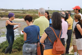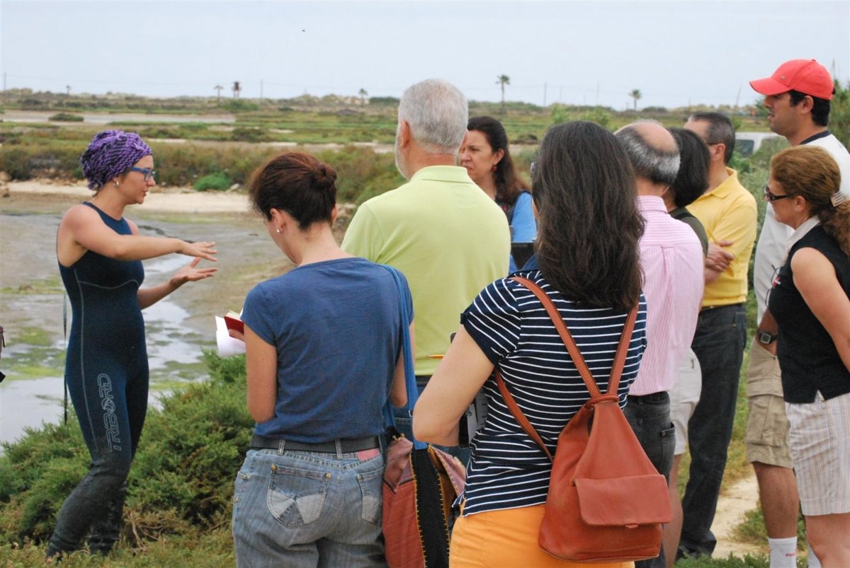 La ruta comienza temprano con la recogida de algas en las marismas de San Fernando antes de visitar el centro de visitantes del parque natural de la Bahía de Cádiz, donde el reloj biológico no lo marca el día y la noche sino las mareas y una flora y una fauna adaptadas a un medio extremo. Un laberinto de caños, agua y sal.