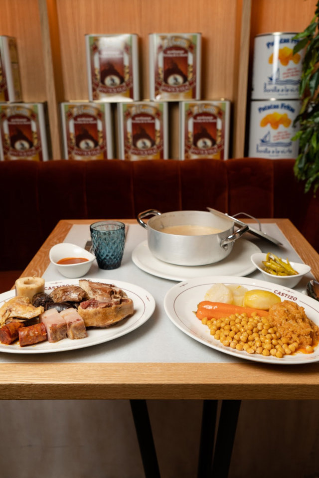 En las tabernas de Castizo honran la tradición madrileña elaborando sus cocidos con producto ecológico, de proximidad y una elaboración cuidada al detalle. Servido en sus tres vuelcos clásicos, comienza con una sopa de fideos intensa y reconfortante, elaborada a partir de un caldo reducido lentamente hasta alcanzar el equilibrio perfecto de sabor, para seguir con un segundo vuelco con garbanzos castellanos cultivado en Madrid, acompañado de patata, zanahoria, nabo y repollo ecológico, respetando la esencia de la receta de siempre y poniendo en valor la huerta cercana. El tercer vuelco es un festín para los amantes de la buena mesa con harrete, costilla y tuétano de vaca, pollo de corral, chorizo de Guijuelo,