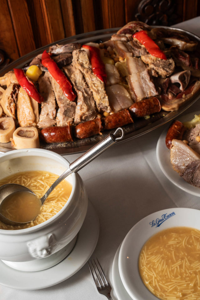 En La Gran Tasca el protagonista de su cocina es su cocido. El plato castizo por excelencia se prepara con mimo en esta casa de comidas, ya que la sopa se elabora a lo largo de dos días, mientras que la sopera se deja en la mesa junto a una bandeja con los 15 ingredientes con los que lo elaboran: carnes, garbanzos de Fuentesaúco, verduras y hortalizas, gallina campera, chorizo ahumado casero y morcilla, que se acompaña de otro bocado muy especial, su pelota de carne picada mixta rebozada y cocida en el propio caldo.