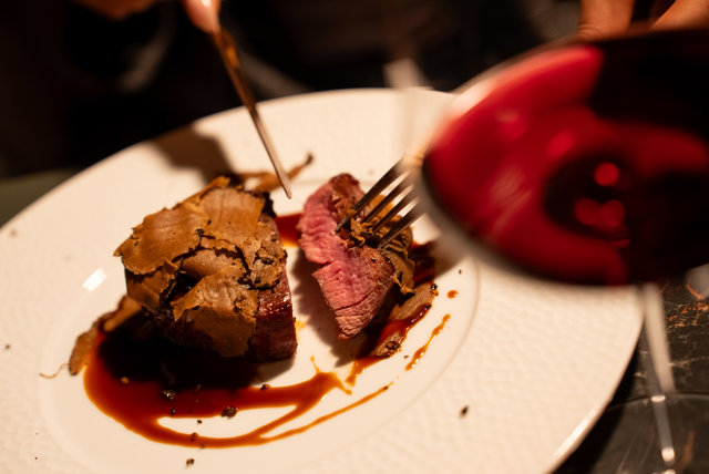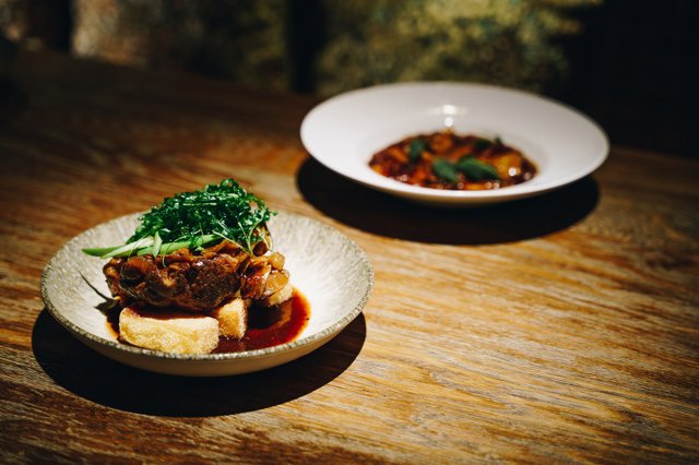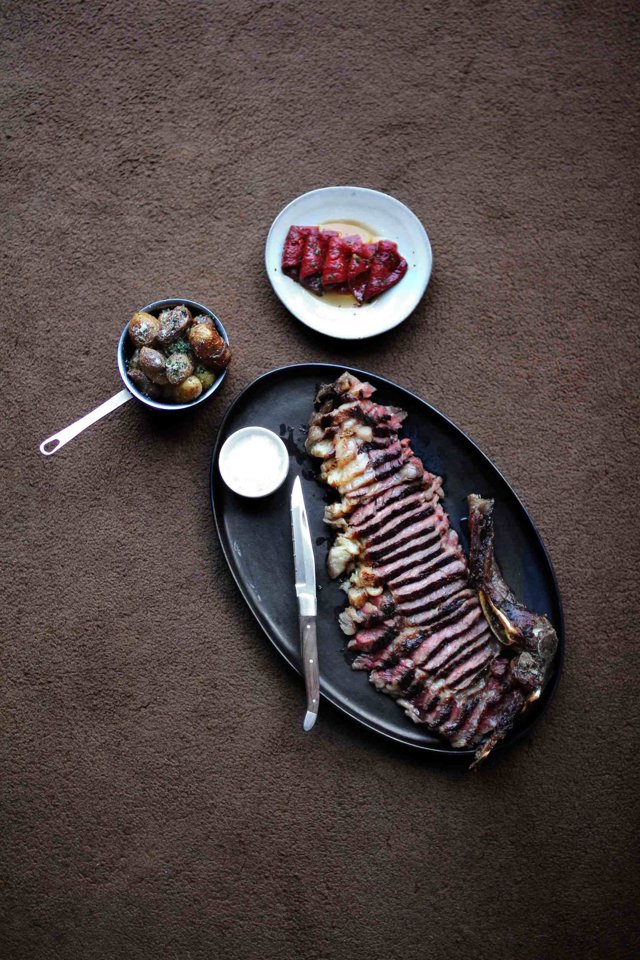 En Leña, el 'steakhouse' del chef Dani García, celebra estos días con una propuesta marcada por los aromas de la brasa y el sabor inconfundible del humo con varios menús (90, 95 y 100 euros) en los que encontrar sus 'must' con entrantes a compartir como el aguacate de Málaga a la brasa, la burrata ahumada, su foie para untar y ajetes aliñados o la icónica burger que le dio sentido a todo, para luego degustar un principal como el ribeye de vaca vieja con patatas fritas, el porterhouse de ternera con cebolla gratinada con trufa y patatas fritas o el chuletón de vaca especial. Mientras, en el postre no faltan clásico también como el flan que quiso ser tocino de cielo o la tarta di rose.