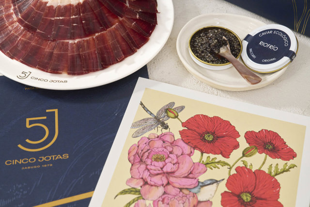 Una propuesta que marida sabor, arte y naturaleza en una experiencia gastronómica única es lo que propone Cinco Jotas y Riofrío, junto a la artista Ana Jarén, para este San Valentín con 'Flores que perduran', un pack exclusivo de edición limitada pensado para compartir y disfrutar en pareja. La propuesta incluye un loncheado de jamón de bellota 100% ibérico Cinco Jotas, una lata de caviar ecológico Naccarii de Riofrío y una lámina floral de edición limitada creada para la ocasión por la artista, que interpreta de manera delicada y poética la flora y fauna del entorno natural en el que se encuentra Jabugo y Riofrío.