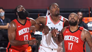 El jugador español de los Toronto Raptors Serge Ibaka (en el centro) en el partido de pretemporada de la NBA ante Houston Rockets - NBA.COM