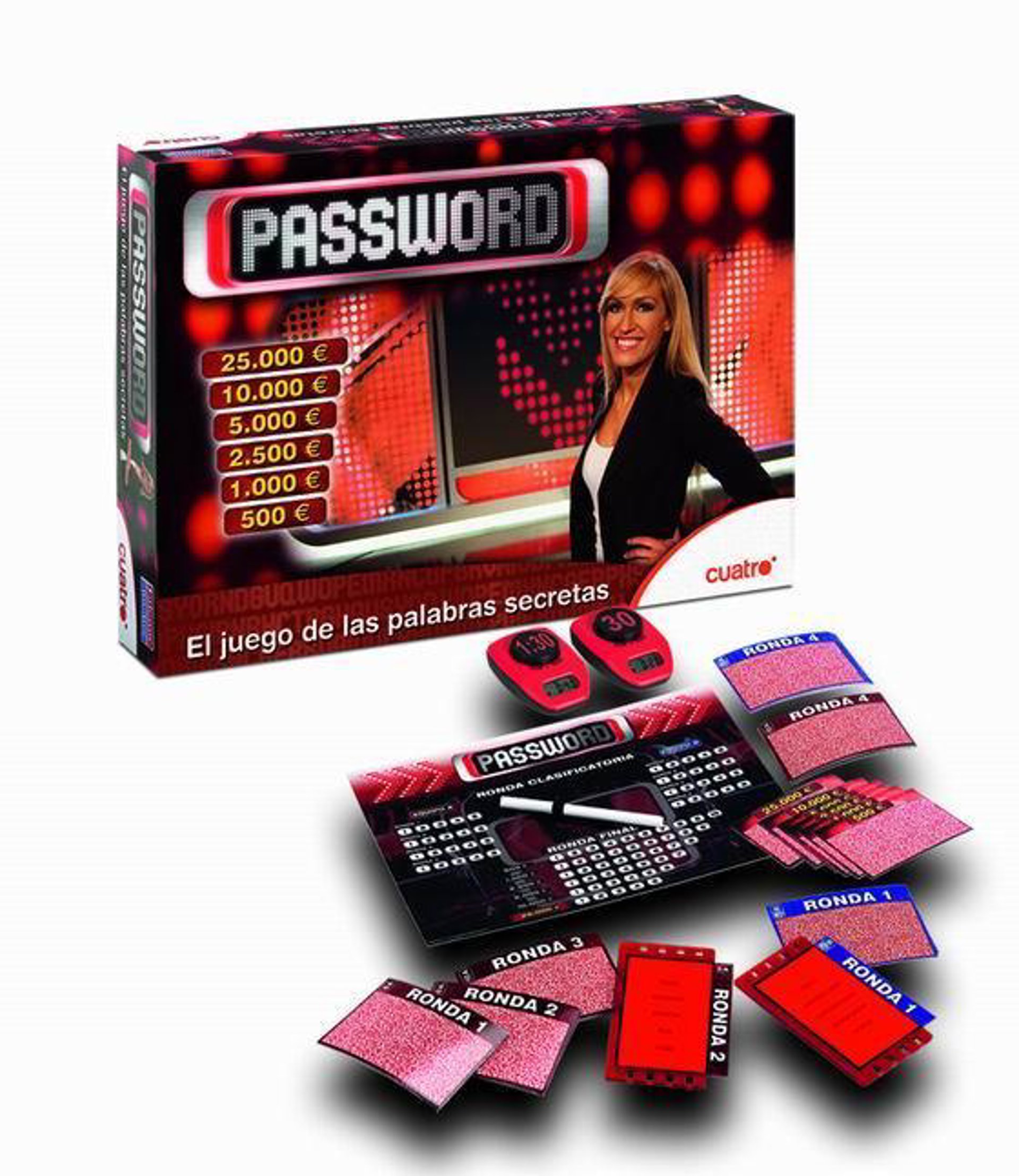 El juego de mesa de 'Password' cuenta con todo el material necesario: tablero, un rotulador, más de 1.700 palabras ocultas, dos visores y dos cronómetros. El desarrollo es el mismo que en el concurso de Cuatro: descubrir la palabra secreta y ganar los 25.000 euros de premio.