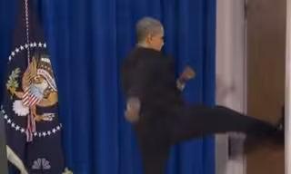 "Muchas gracias a todos y buenas noches". Así cierra Obama una rueda de prensa en la casa Blanca. Hasta aquí todo normal. Lo mejor llega después cuando el presidente encara la puerta ubicada a su izquierda y la abre con una tremenda patada.