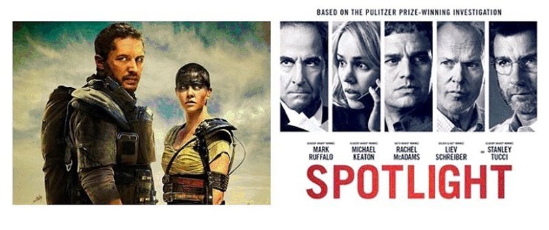 La primera, dirigida Thomas McCarthy y protagonizada por Mark Ruffalo, Michael Keaton y Rachel McAdams, se ha hecho con la estatuilla a Mejor Película y Mejor Guion Original para Josh Singer y Tom McCarthy, mientras que la cuarta entrega de la saga de ciencia-ficción ha conseguido ser la producción más galardonada en la última entrega de premios de Hollywood, con un total de seis Oscar.