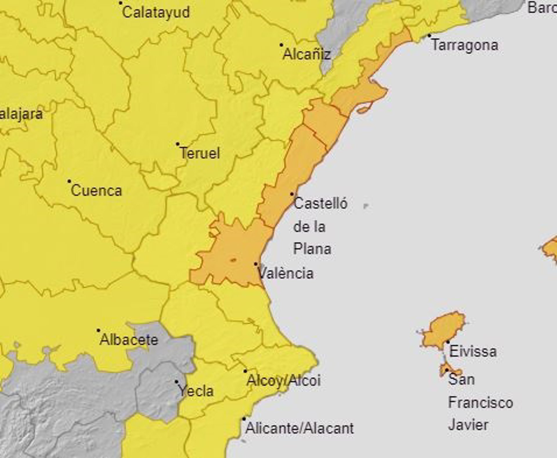 Per la seua banda, en la resta de la Comunitat Valenciana estar actiu l'avís groc, amb la previsió de precipitacions acumulades de fins a 80 l/m2 en 12 hores a l'interior sud de Castelló.