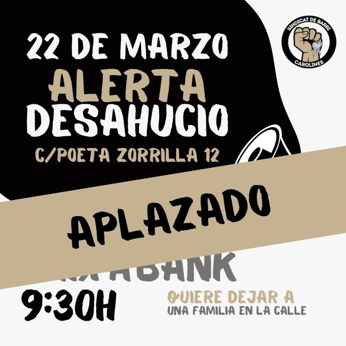 El desallotjament estava previst que es produïra aquest divendres 22 de març, per la qual cosa l'organització havia citat al veïnat al carrer Poeta Zorrilla, 12, d'Alacant --on se situa el domicili-- per a tractar de paralitzar-ho.