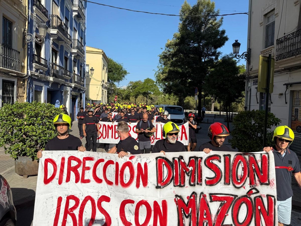 Els bombers han eixit de plaça d'Espanya amb pancartes en les quals s'han llegit missatges com a 'Direcció dimissió, aneu-vos amb Mazón', 'Avelino vas per mal camí' (en al·lusió al diputat provincial de Bombers, Avelino Mascarell) i 'Bombers en lluita'.